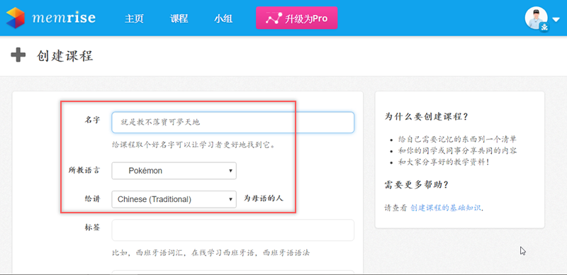 例如阿湯要來創一個寶可夢的教學分享,在分類中找到在娛樂項目裡真的有「 Pokémon」,再選擇要教給母語是什麼的人(這項用在語言課程比較有差別),就可以建立了。