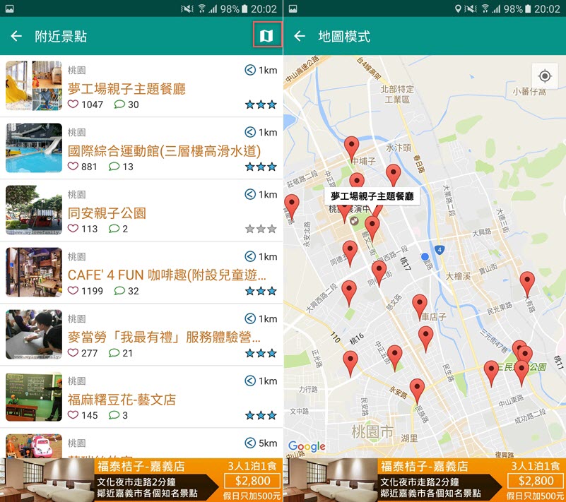 從首頁連結先來看看附近有哪些景點吧,預設依距離排列,也可以從右上角切換用地圖模式看得比較清楚,很多點老實說阿湯也不知道那裡適合帶小孩去玩。