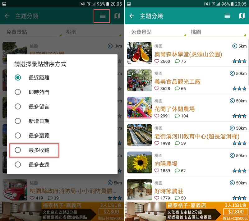 阿湯想看看桃園有哪些大受好評的免費景點,可以從右上角可以改變排序方式,點「最多收藏」,第一名原來是最近的虎頭山公園,不過收藏第二名的人更多,可能是第二名之後的景點比較遠吧?