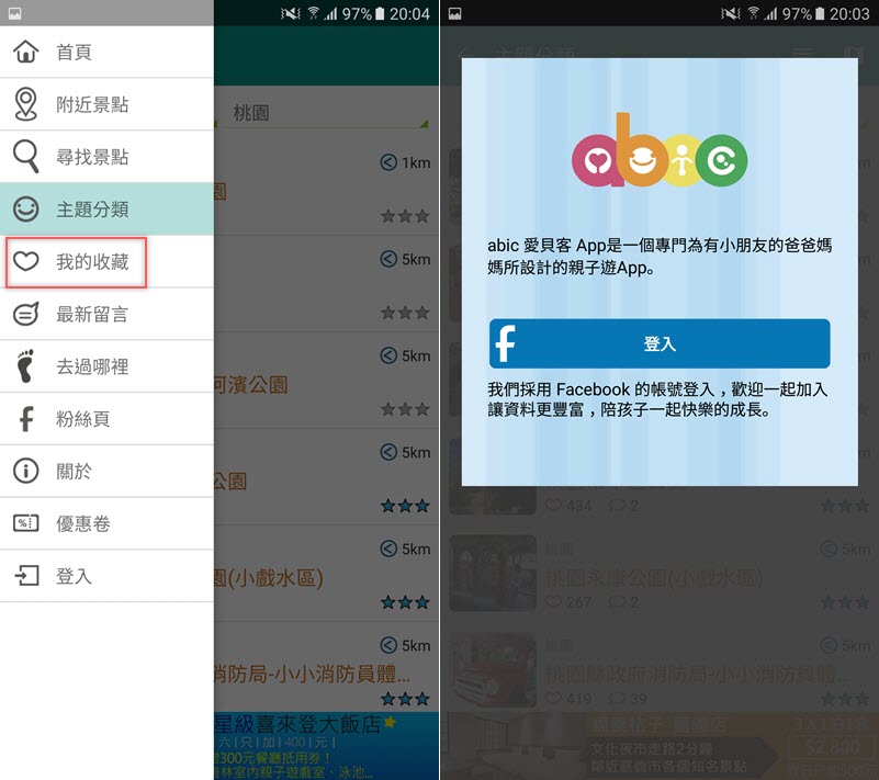 左排功能列,如果點「我的收藏」或「去過哪裡」,都會出現臉書登入頁面,爸爸媽媽們想收集更多資訊就登入吧,可以從粉絲團得到更多訊息。