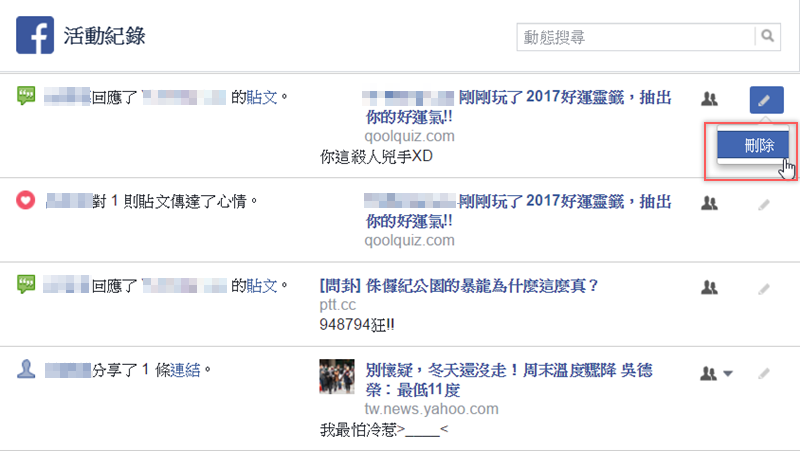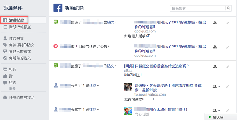 然後就進到活動紀錄頁面,由上往下依時間近到遠排序,所有自己或其他人在你的動態消息頁,留下的貼文、相片、按讚都有紀錄。