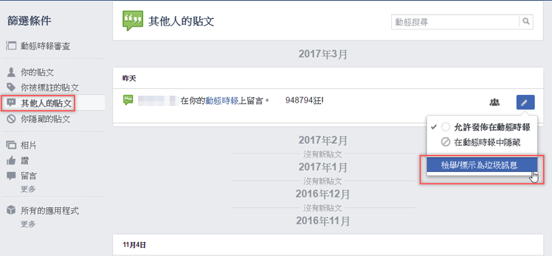 可以在左排更改篩選條件來做更精確的過濾,像是點「其他人的貼文」就可以對這些貼文進行編輯,看是要允許發布或隱藏,或是標示為垃圾訊息。