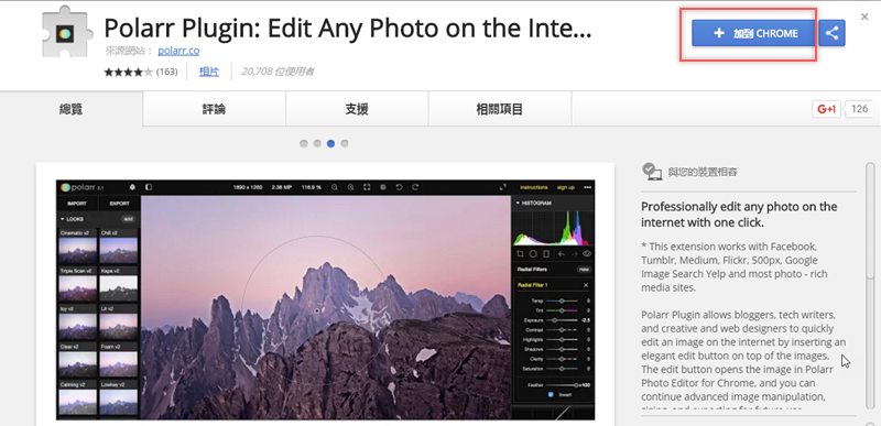 如果要將網路上的圖片進行編輯,通常要按滑鼠右鍵另存新檔到電腦後才能處理,最近阿湯發現一個 Chrome 擴充套件「Polarr Plugin」,可以直接對 Google 瀏覽器上的圖片進行編輯後,再下載到電腦或雲端硬碟,而且能修改的內容相當豐富,除了基本的色溫、色階、曝光度,而可以針對圖片的色調曲線、色相、飽和度、亮度等細節處理,功能蠻強大的,常有修圖需求的朋友可以試試看。