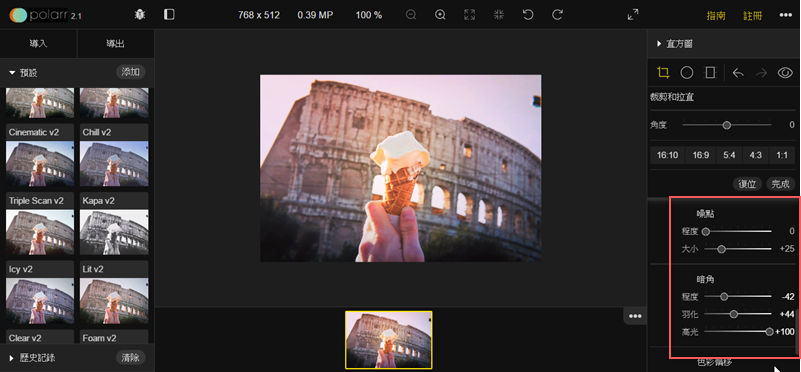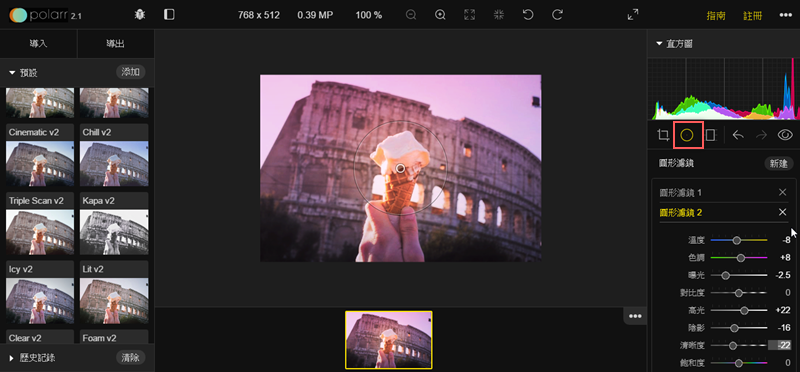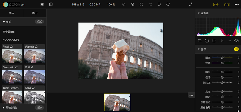 就進到 Polarr Plugin 裡了,最上排可以縮放、旋轉、改全螢幕,左排主要是各種濾鏡,右排則是直方圖檢視和各項細節調整。