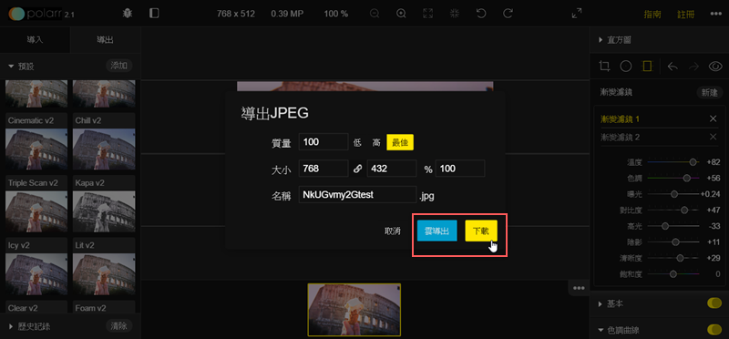 改好就可以按左上方「導出」,質量有低中高可以選,大小、名稱也能自己填,最後看要點「雲導出」還是下載到電腦。