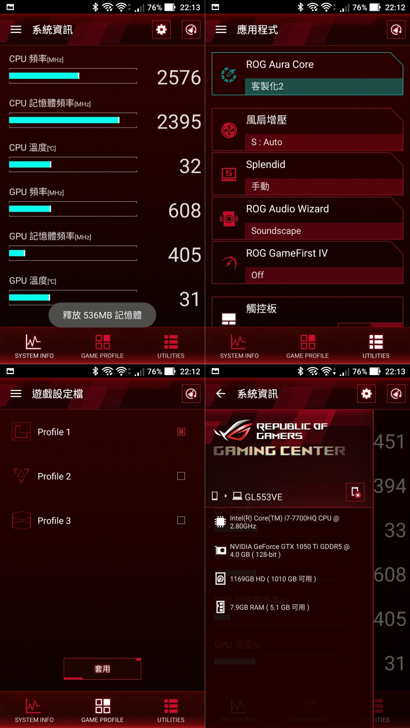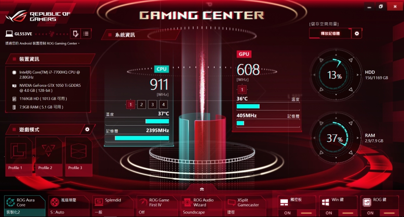 除了我們在前面所提到的 AURA 鍵盤背光控制軟體之外,還有內建 GAMING CENTER,可以在這裡一鍵釋放記憶體、切換遊戲模式、查看裝置目前的系統及硬體狀態等,一個面板搞定全部的需求,完全就是為遊戲而生的控制器。