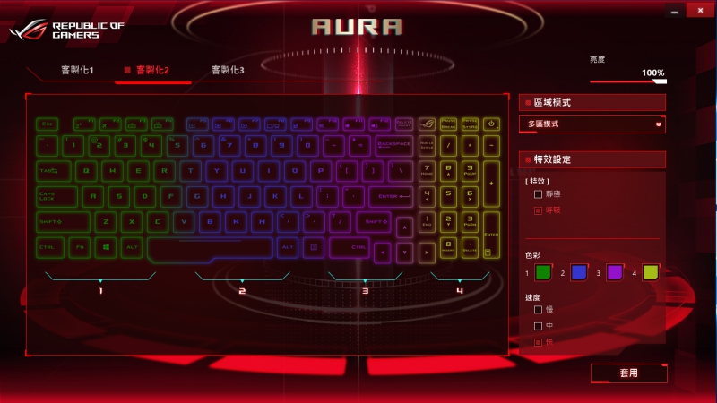 鍵盤的四區燈光色彩,可以隨時透過預載的 AURA 軟體進行設定調整,隨時切換不同的色彩及變換方式,轉換玩遊戲的心情。