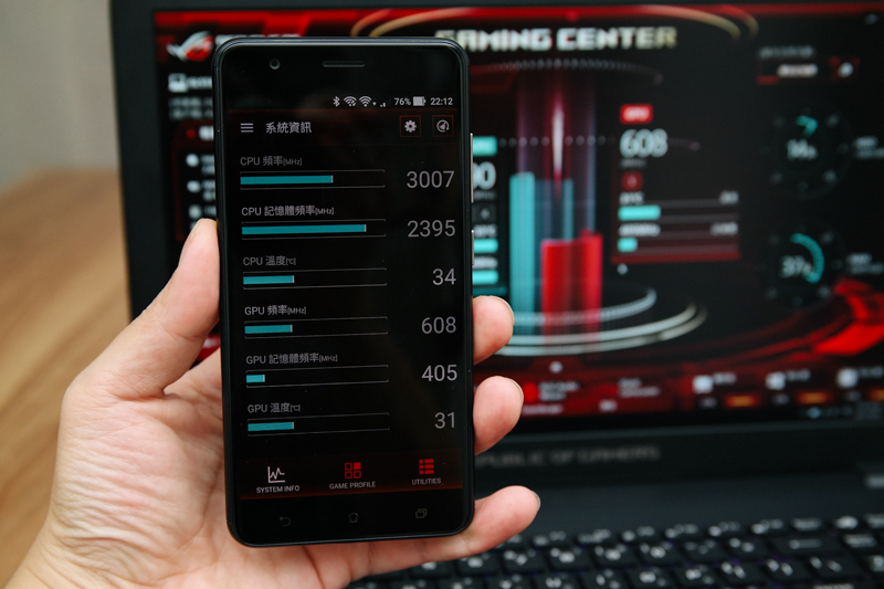 而這 GAMING CENTER 如果是在遊戲中想查看也不需要再跳回桌面,玩遊戲中也可以直接透過 ROG Gaming Center APP 連線,就能即時的查看電腦系統狀態或是切換不同遊戲設定檔。