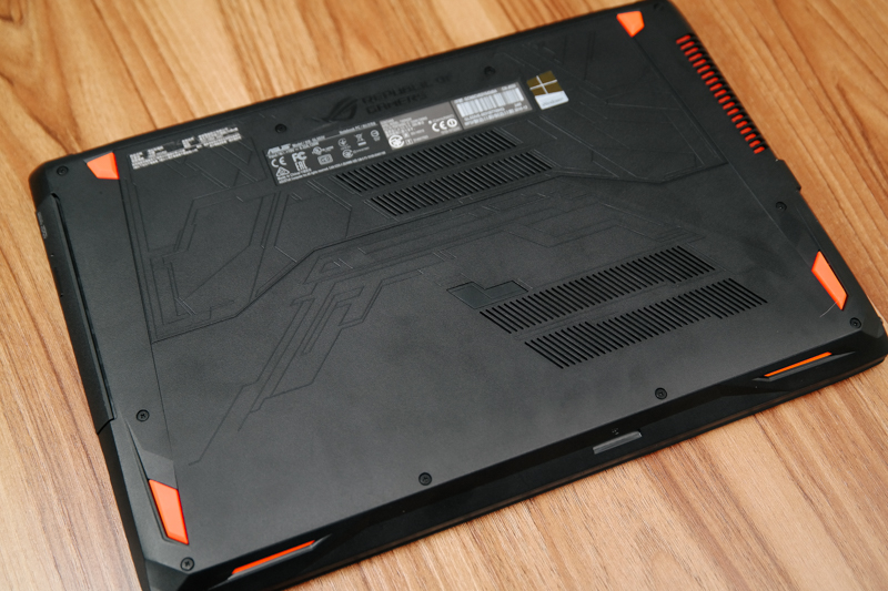 散熱孔分別在底部有四排,側邊有一個,內建 ROG 獨家的 Cooling Overboost 散熱技術,可調整風扇速度,加上智慧散熱設計,讓玩家在執行需要高效能的遊戲同時,仍然保有很好的穩定性。