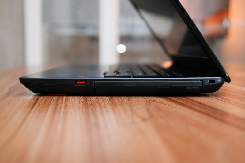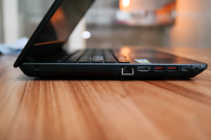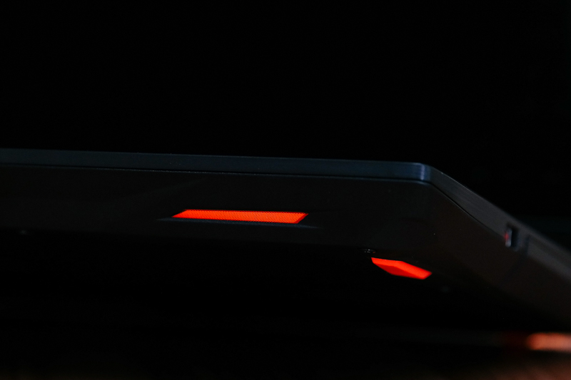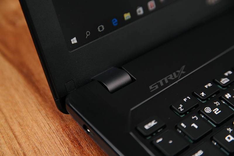 不知道電競玩家們在挑選筆電時會不會注意軸承設計,阿湯自己是不論筆電類型,螢幕 A 蓋與筆電主體的配置比還有軸承的設計很重要,除了耐用之外,更要能夠一手開蓋,有些筆電軸承會太過生硬,當你用一手開蓋時會連帶下方主體都被一併上拉,變成要用二隻手來打開筆電,而 GL553 在這部份同樣設計的很好,一隻手就能直接開蓋使用。