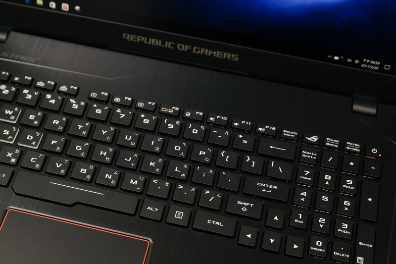 除了 A 蓋之外,裡面也全部都採用髮絲紋設計,質感真的很棒,在觸控板的部份採用無縫設計之外,再搭配一圈橘色線條圍繞,很像科幻電影中的電腦面板感覺。