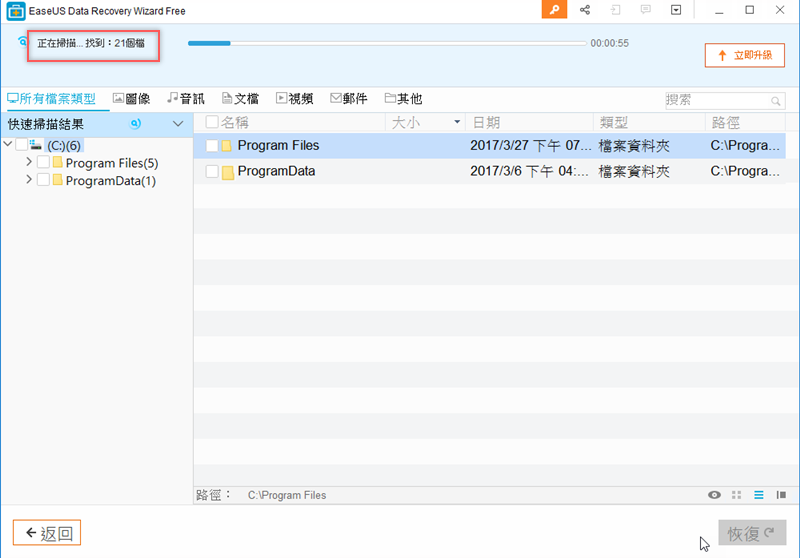 接著會進行快速掃描,這一步是用來找出「被刪除」的檔案,所以比較好找不到一分鐘就掃完了,也可以先選擇檔案類型來搜尋更精確。
