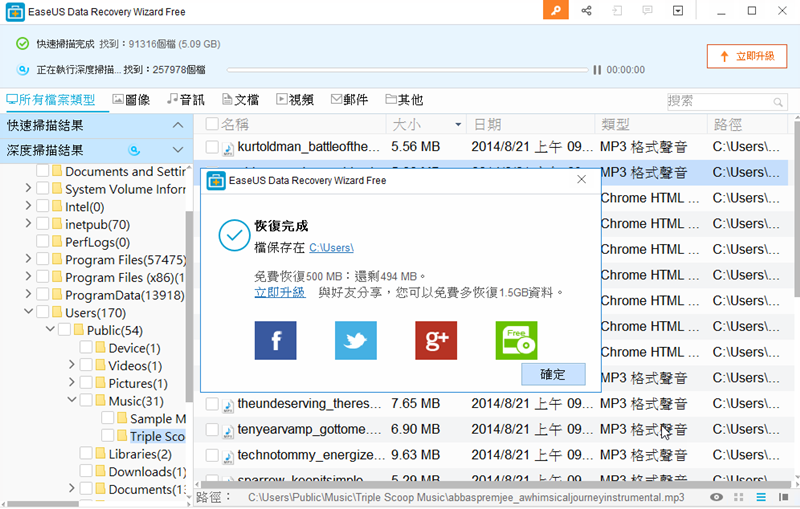 回到系統顯示目前恢復額度還剩 494 MB,分享給朋友可以再加贈 1.5 GB,或是升級到付費版本,阿湯對照了一下官網,升級之後可以恢復的資料量無上限、終身免費升級、免費技術支援等等,如果常有這方面的需求就可以考慮升級。