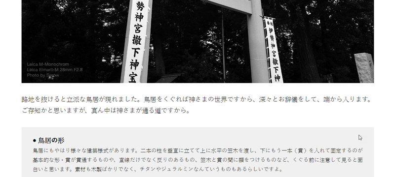 跟其他相簿不同的是,文字介紹比較偏軟性而不是硬梆梆的講用了什麼技巧,就像看一篇隨興的旅遊心得,還穿插了圖片介紹,下圖就有加入對「鳥居形式」的註解。