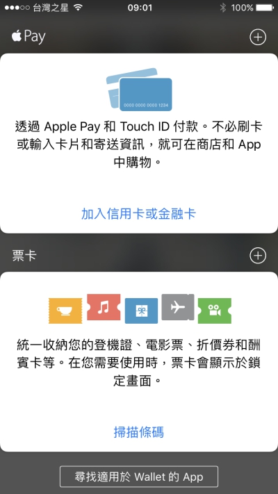 阿湯以 iPhone 做範例給大家說明,其實加入很簡單,手機裡找到內建的「Wallet」APP,目前在台灣的 Apple Pay 以信用卡為主,目前還不支援加入金融卡,點加「加入信用卡或金融卡」。