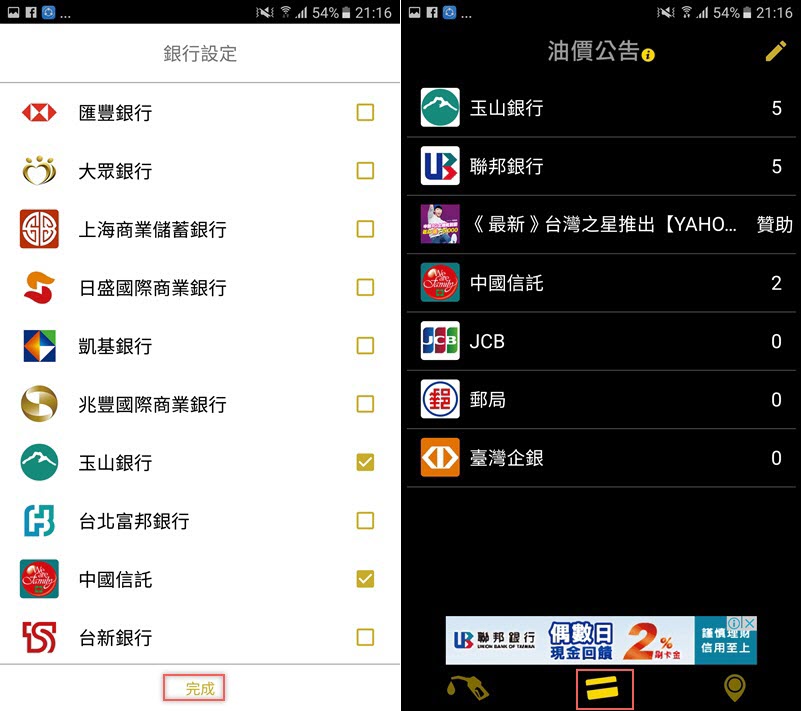點開右上角可以設定銀行,畢竟一般人不是所有銀行的卡都有,就選擇你有的、或是你想知道訊息的銀行,點完成,回到頁面就會出現自己的設定了。
