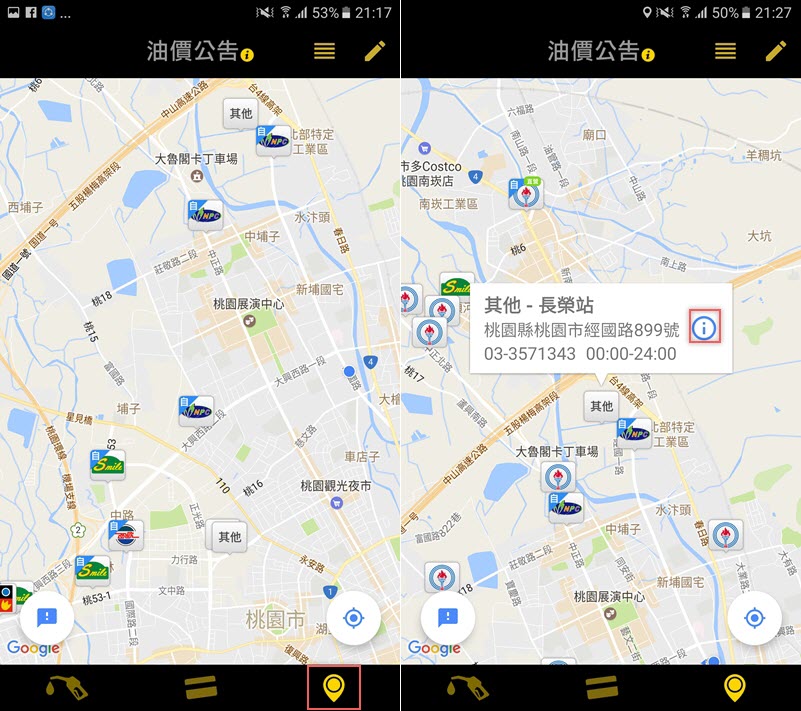 然後可以連結 Google 地圖導航,比較路線知道怎麼走,尤其在外地找加油站很好用啊,也可以將地圖切換成清單模式,如果要找特定的加油站,可以點右上角編輯。