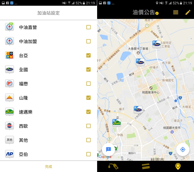 接著就設定想要顯示的加油站,一定有些加油站是自己有會員卡或是其他原因不喜歡,就取消,地圖就會只出現自己想去的加油站。