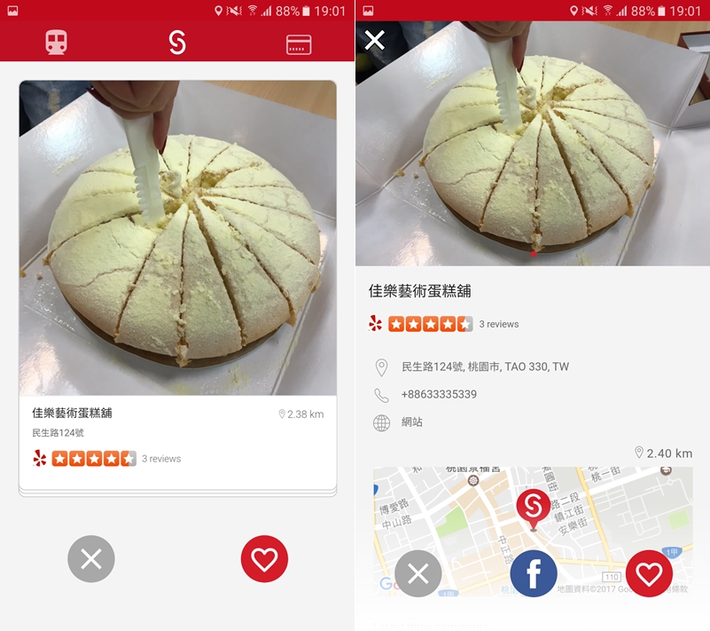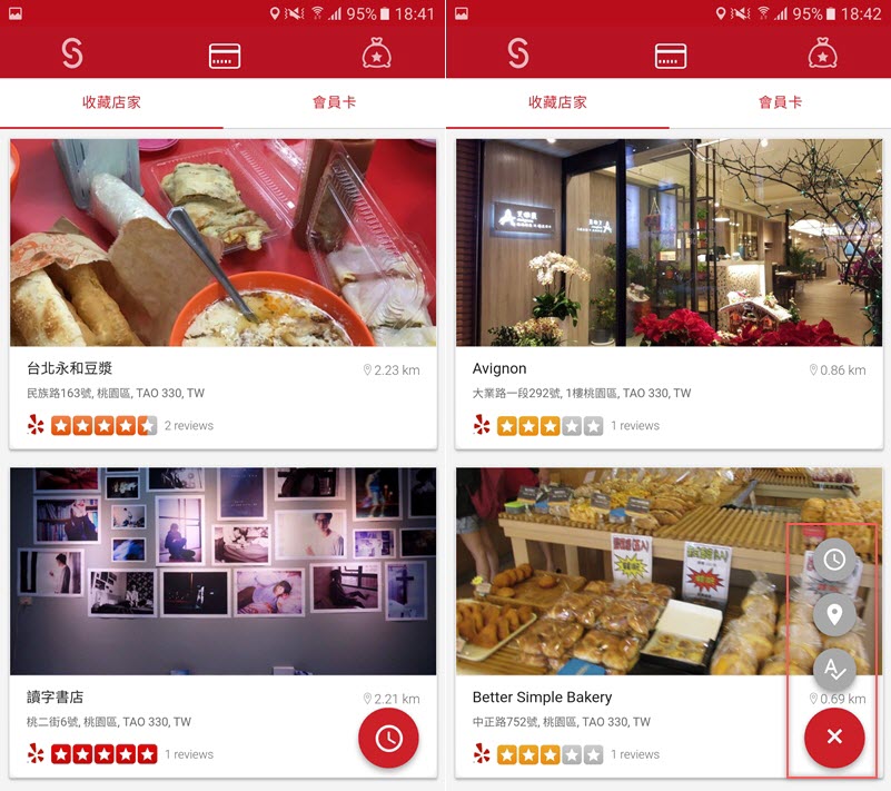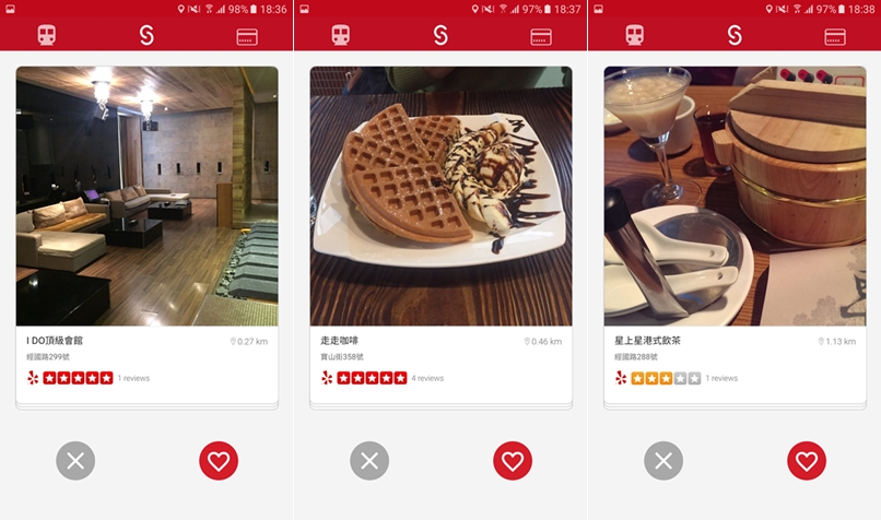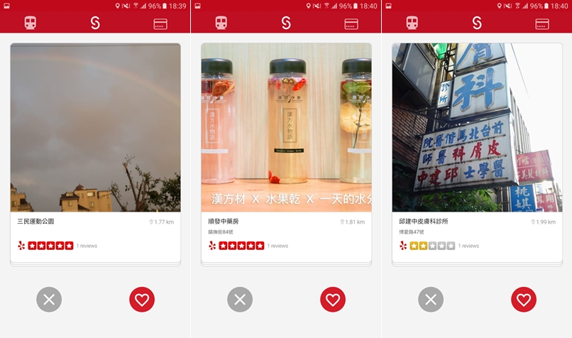 開啟後會依定位遠近來列出商家,也會有地址與評價,當顯示商店的時候,往右滑是加入、往左滑是取消,或是點下面的「♡」「X」來整理,這樣可以快速挑出喜歡的商家。