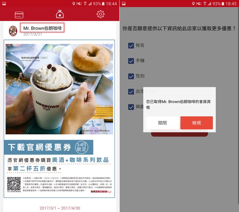 點上面星星圖示切換到優惠資訊頁面,會出現收藏的商家中哪些有優惠活動,再點商家名稱,就會自動取得會員資格,個別資料的部分可以取消不想提供的內容,或按檢視來查看細節。