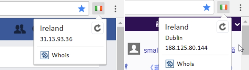 像我們常用的臉書和奇摩網站,主機原來都在愛爾蘭,奇摩還有顯示城市名稱 Dublin。