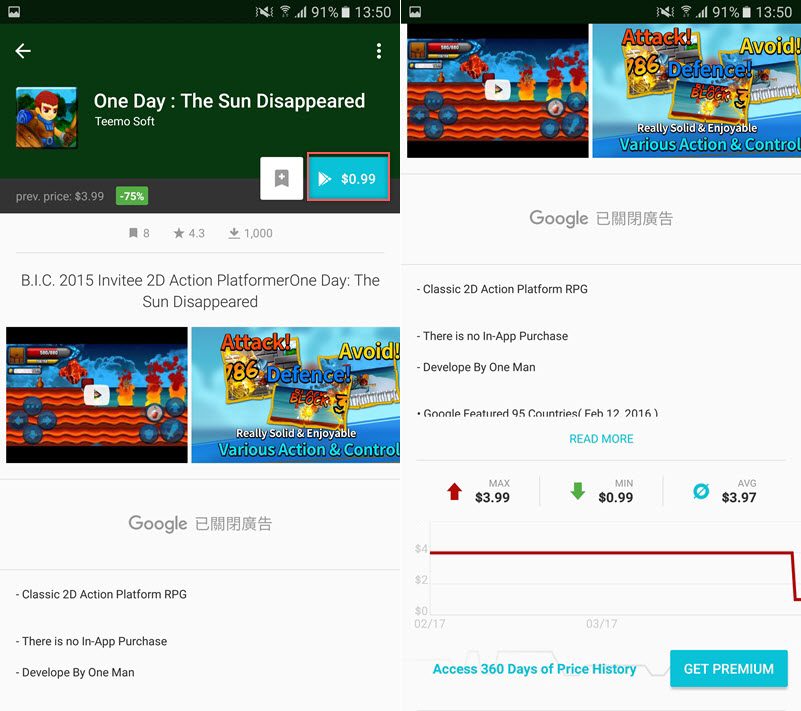 點進去有 APP 的簡介和目前的優惠,也可以加入追蹤或直接連上 Play 商店下載,往下可以看到價格走勢,像這個 APP 最高到$3.99 最低就是目前的$0.99。