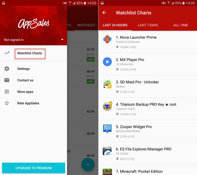 左上角清單圖示點開,第一項「WATCHLIST CHARTS」是目前被加入清單的排行榜,分為 24 小時、7 天內和所有時間,可以參考看看別人都下載什麼。