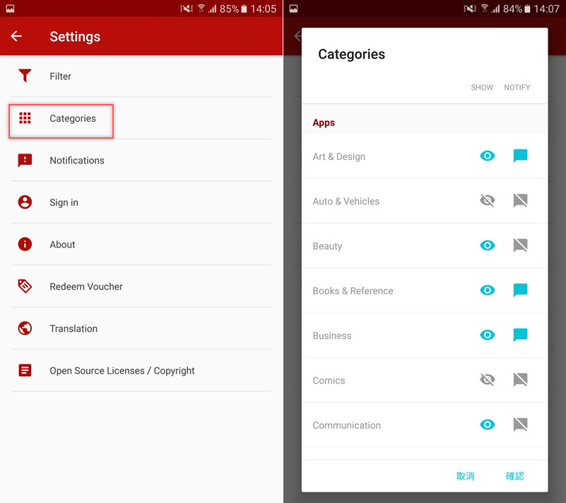 連到設定頁,點「Categories」就能設定喜歡的 APP 類別,預設是全部都會顯示和通知,改成自己想看到和獲取通知的 APP 類型,再回到瀏覽頁面就會剔除一些不需要的 APP 了。