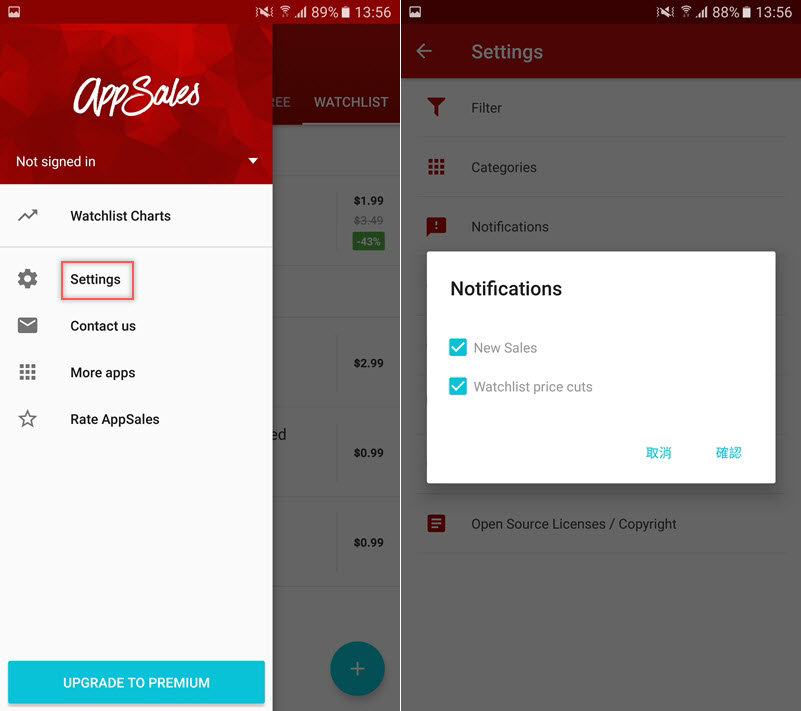 這裡就是限時免費區,一樣可以點名稱後面的藍色色塊連到 Play 商店,如果點下面「GET PREMIUM」就會出現「AppSales」付費版的相關資訊,包括可以加長歷史價格的時間範圍、免廣告等等,有需要就花$61 購買吧。