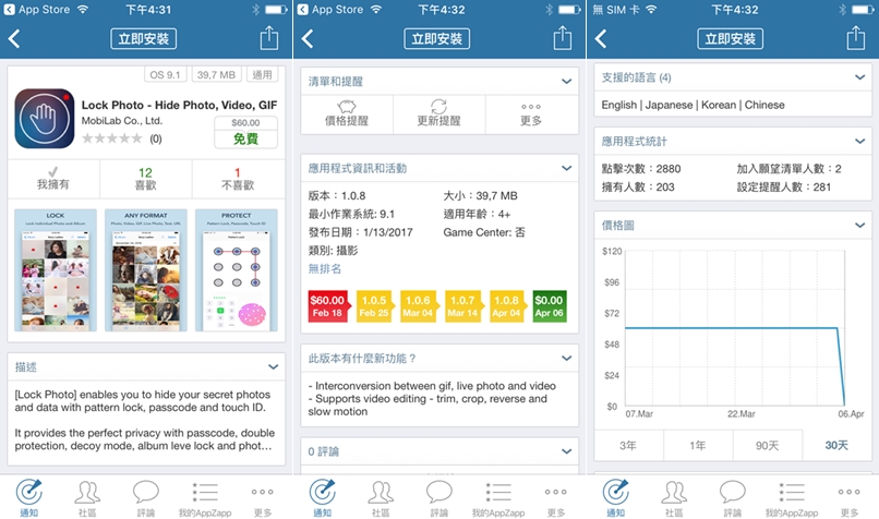 介紹另一個 iOS 的類似 APP「AppZapp Notify 」,是中文介面,大家應該會覺得親和一點,它比較著重在個人設定的細節,一樣可以設提醒,但要設帳號登入。