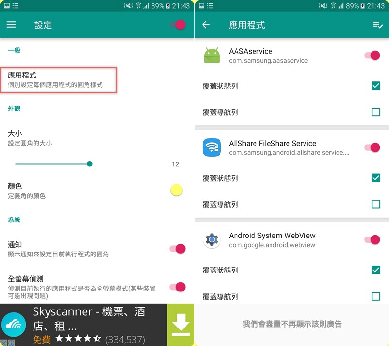 回到 APP 首頁,點「應用程式」進去可以針對每個程式進行更改,看要不要關閉圓角或是覆蓋狀態列、導航列,如果覺得沒差就維持原設定吧。