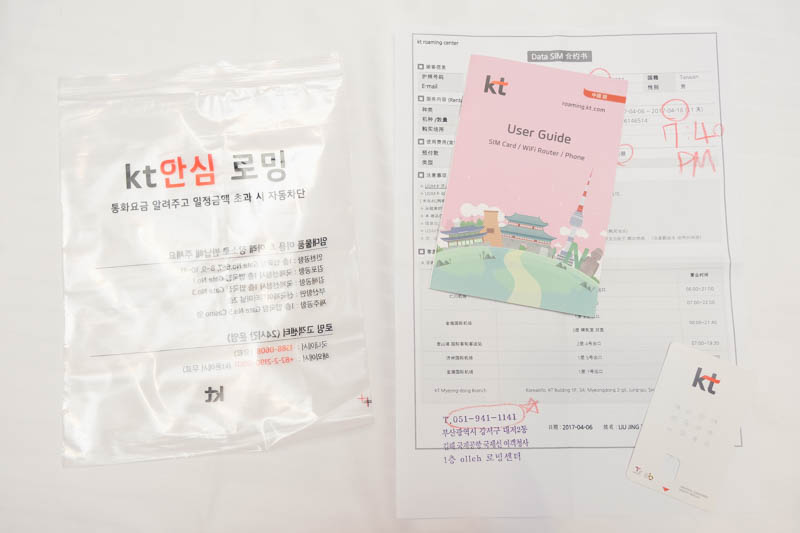 拿到的東西就是這樣而已,使用手冊跟訂單說明,我來 8 天,所以買的是 10 天用的,用 SIM 卡的好處是不需要歸還,回國直接丟掉就可以了,現在也有很多雙卡雙待的手機(請用支援 4G+3G 的),這樣就可以同時電話漫遊(不開通網路),另一方面用韓國的 KT Olleh 做為上網主力,阿湯還是得接來自台灣的電話,所以這樣做。