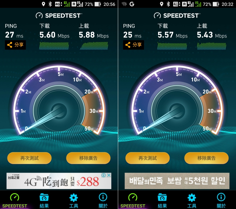 最後再分享一下速度的部份,KT Olleh 在韓國是很大的電信商,到處都可以看到他們的店面,所以速度跟穩定度都不用擔心,只不過 KT Olleh 有限制 5Mbps 的速度,所以不管走到哪速度都維持在 6Mbps 以下,雖然不算是飛快,但在各方面使用下來是綽綽有餘了,像是 FB、地圖導航等,而且幾乎所有的點都能維持在 5Mbps 的峰值,如果你想要沒限制的使用,大概是花多一點錢選 EG SIM 或是找 Wi-Fi 機會是不錯的選擇。