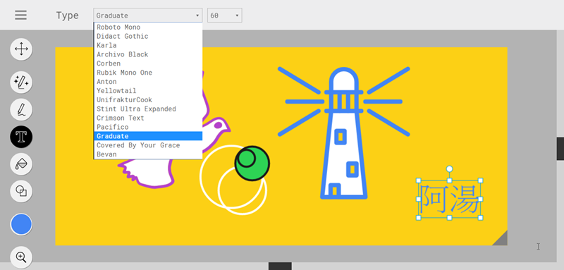 最後再打上文字,不過沒有中文字體可選,大小定 60 好了,也可以用拉的,完成。
