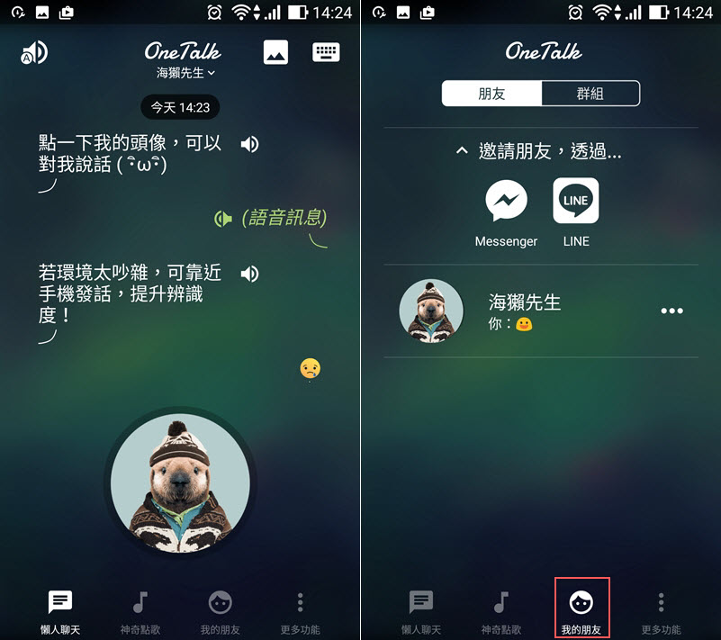 下載後開啟會先出現海獺先生,你可以跟他聊天,或是邀請朋友一起裝這個 APP,當作多一個聊天室。