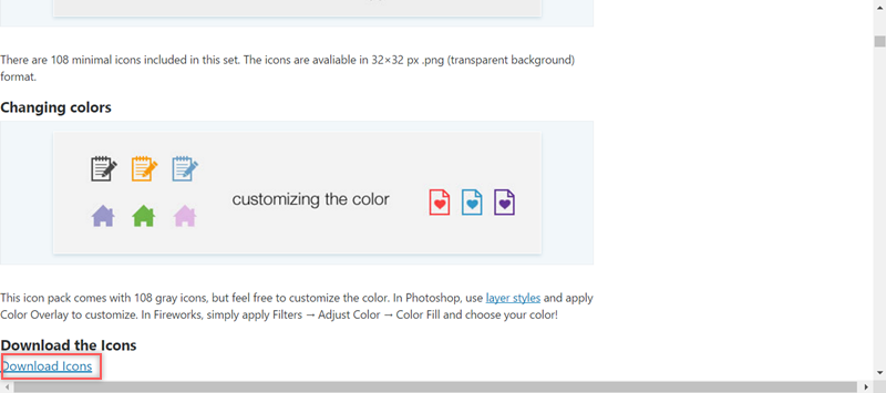 連到說明頁,介紹總共有 108 個圖標,每個尺寸是 32*32,還可以改顏色等等,點「Download」後,下載出來的是壓縮檔,解壓縮就可以當作 PNG 圖片檔來用了。