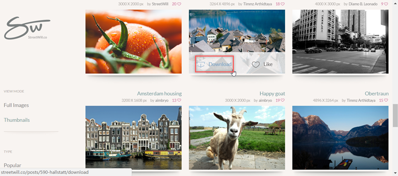預設也是大張圖片的瀏覽方式,可以在左排功能切換成縮圖模式,從圖片上就能看到尺寸、拍攝者跟喜愛人數,點圖就可以按讚或下載,簡單一個頁面搞定。