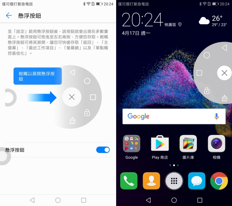 懸浮按鈕同樣也是非常實用的功能,開啟後會在畫面上出現一個可以自行擺放位置的快捷懸浮按鈕,讓我們更適合用在單手操作。