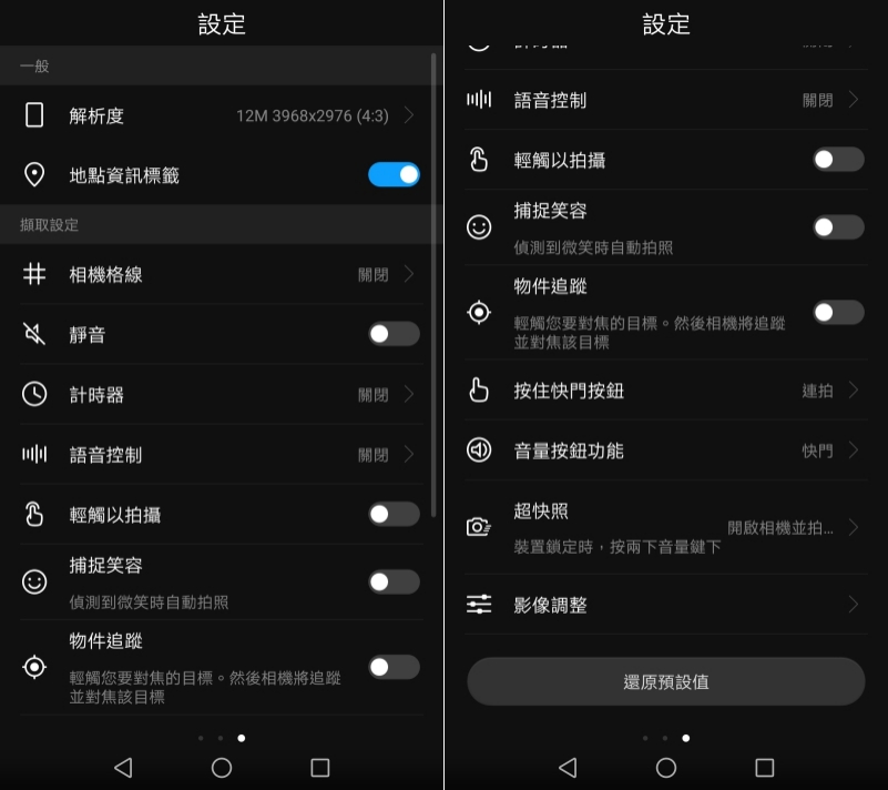 在設定中還有很多功能可以開啟使用,比如語音控制、輕觸拍攝,微笑快門還有厲害的物件追蹤,這追毛小孩或皮小孩必備。