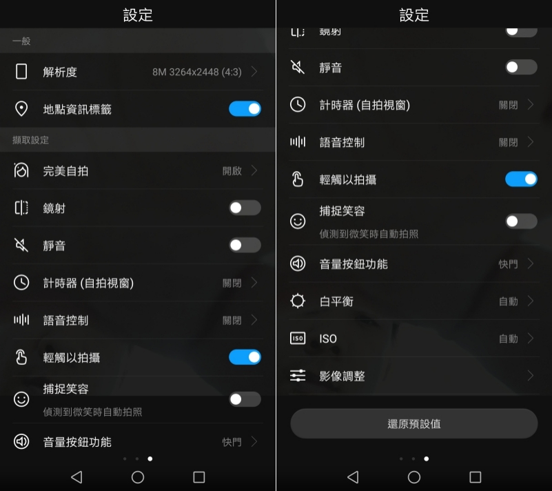 在前鏡頭的設定中,除了剛剛主鏡頭的功能之外,還有鏡射功能可以拿來當鏡子也是很不錯的(內建也有鏡子 APP 可以使用)。