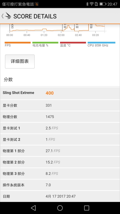 3DMark 綜合分數得到 400,一般的遊戲像 Pokemon Go、Super Mario Run 阿湯測試是沒問題的。