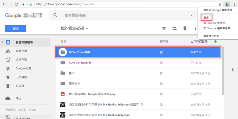 打開雲端硬碟隨便新增一個資料夾,然後到右上角剛下載外掛的圖示,按滑鼠右鍵打開,再點「選項」。
