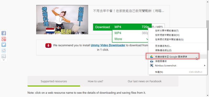然後選一個線上下載 YouTube 的網站,例如阿湯介紹過的 Savefrom,將影片網址貼上後,到「Download」的旁邊選擇一個檔案格式按右鍵,選「將連結儲存至 Google 雲端硬碟」。