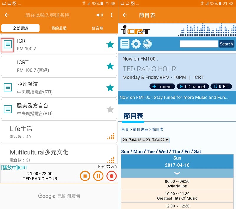 點開外語類來聽個 ICRT 好了,一點就會馬上連接,在最下面顯示目前節目與時間,在頻道名稱旁邊圖示點進去會連到節目表,算是蠻貼心的。