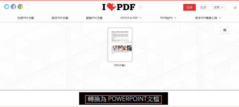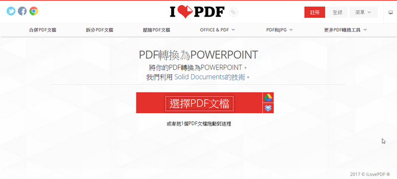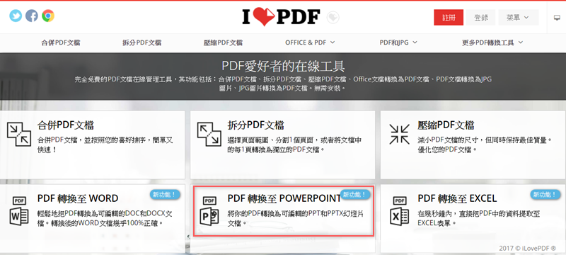 網站首頁就是所有功能與簡介,想用哪個就點進去,也可以從最上排選擇,來試試「PDF 轉 POWERPOINT」。