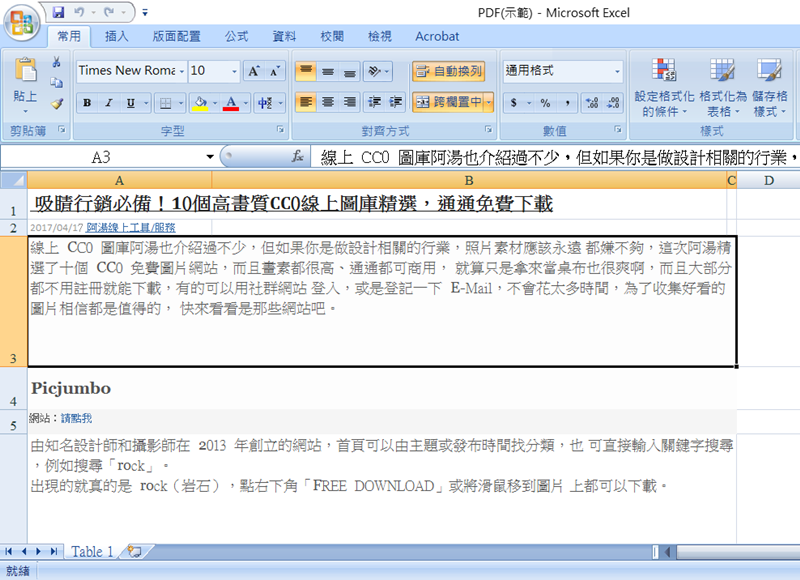 開啟已轉檔的 EXCEL 文件,內容就是依 PDF 順序排列,標題占一格,段落文字占一大格(這要視你的內容而定),但圖片沒有包括在內。