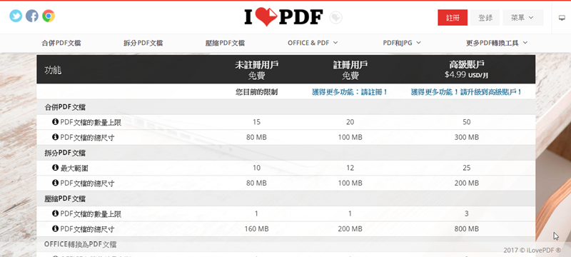 如果有大量轉檔需求可以考慮註冊或付費來增加處理的上限和尺寸,像是解鎖 PDF,未註冊的話一次只能處理一個檔案,註冊後可以用兩個,加上付費可以用 10 個,也能處理更大尺寸的檔案,就看需求了。