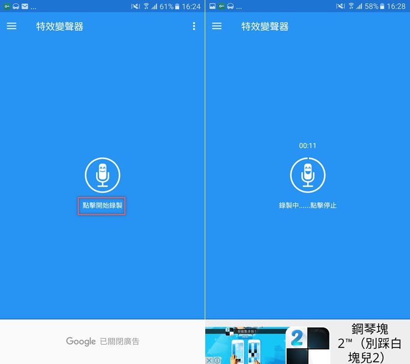 由於這個 APP 只有 Android 版,所以阿湯找了 iOS 的類似版來介紹,不一樣的是錄音要按著麥克風,而且只有六種基本音效可套用,要增加就花錢升級了。
