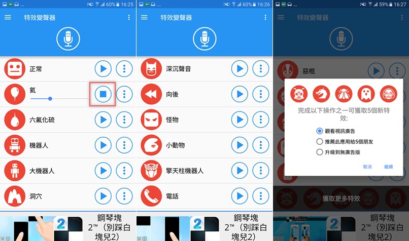 停止後會自動跳出可套用的音效,從氦、六氟化硫這種不清楚是什麼的,到小動物、擎天柱機器人這種大概猜得到音效的,共 40 種,足夠讓你慢慢玩,點箭頭就開始播放,如果看一下廣告、推薦或升級還會得到幾個新特效。