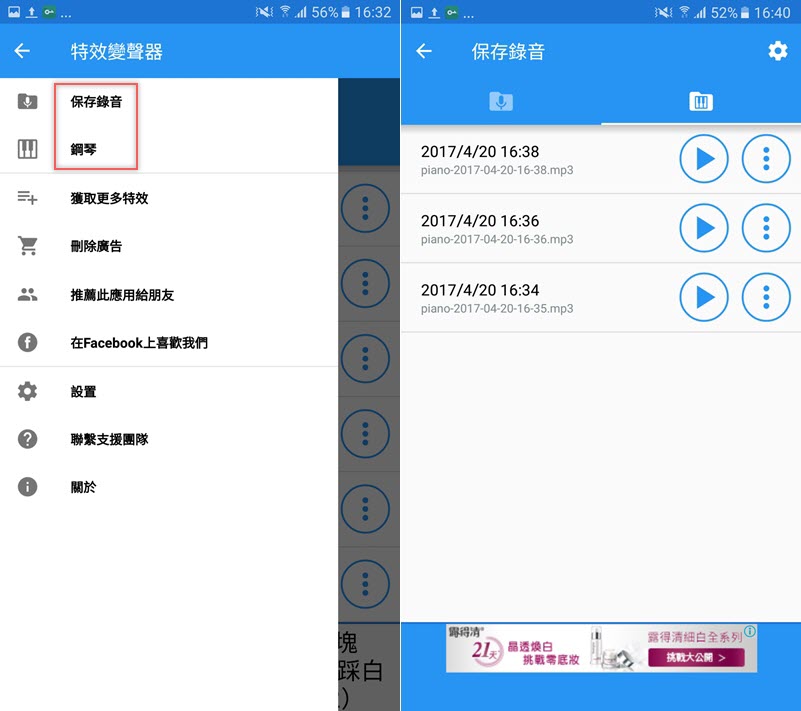 左方設定列拉出來還有其他選項,來看一下保存錄音和鋼琴,保存錄音當然就是有儲存到的音效,通通會在這區。